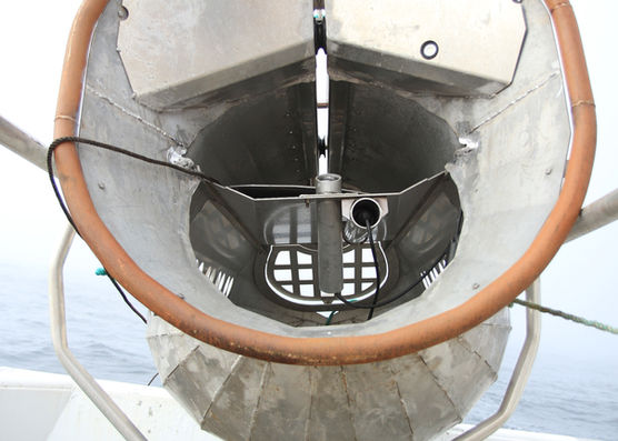 When Sago Extreme reaches the surface, the unit is secured and then lifted onboard with crane. A manually operated handle opens a hatch releasing the catch safely onboard.